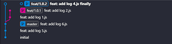 假设我们现在有2条分支,一个为 master,一个为 feat/1.0.1,他们都基于初始的一个提交 add readme 进行检出分支,之后,master 分支增加了 3.js 和 4.js 的文件,分别进行了2次提交,feat/1.0.1 也增加了 1.js 和 2.js 的文件,分别对应以下2条提交记录。